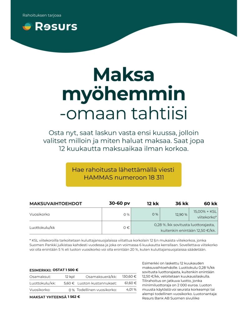 Esimerkkiostos: 1500 €, 12 kk maksuvaihtoehdolla. Vuosikorko: 0 %. Luottokulu/kk: 5,60 €. Todellinen vuosikorko: 4,01 %. Luoton kustannukset: 61,60 €. Maksettava yhteensä: 1562 €. Osamaksuerä/kk: 130,60 €, 12 erää. Luottokulu on 0,28 %/kk sovitusta luottorajasta, kuitenkin enintään 12,50 €/kk. Luottokulu veloitetaan kuukausilaskuilla. Hammashoitotili on jatkuva luotto, jonka minimiluottoraja on 2000 €. Luoton muusta käytöstä voi seurata korkeampi tai alempi todellinen vuosikorko. Luotto ei ole käytössä Ahvenanmaalla. Luotonantaja: Resurs Bank AB Suomen sivuliike.